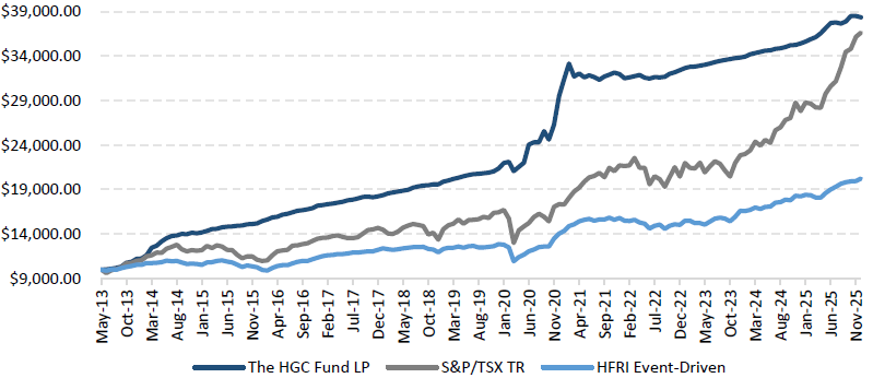 *** S&P/TSX Comp Total Return Index - The TSX Total Return Index is a widely-known equity index of Canadian large-cap companies. Investing in US and Canadian equities long and short is the primary strategy for HGC as part of the merger arbitrage strategy but HGC does not invest in all or necessarily any of the securities that compose the market indexes. Reference to the indexes does not imply that HGC will achieve returns similar to the indexes.